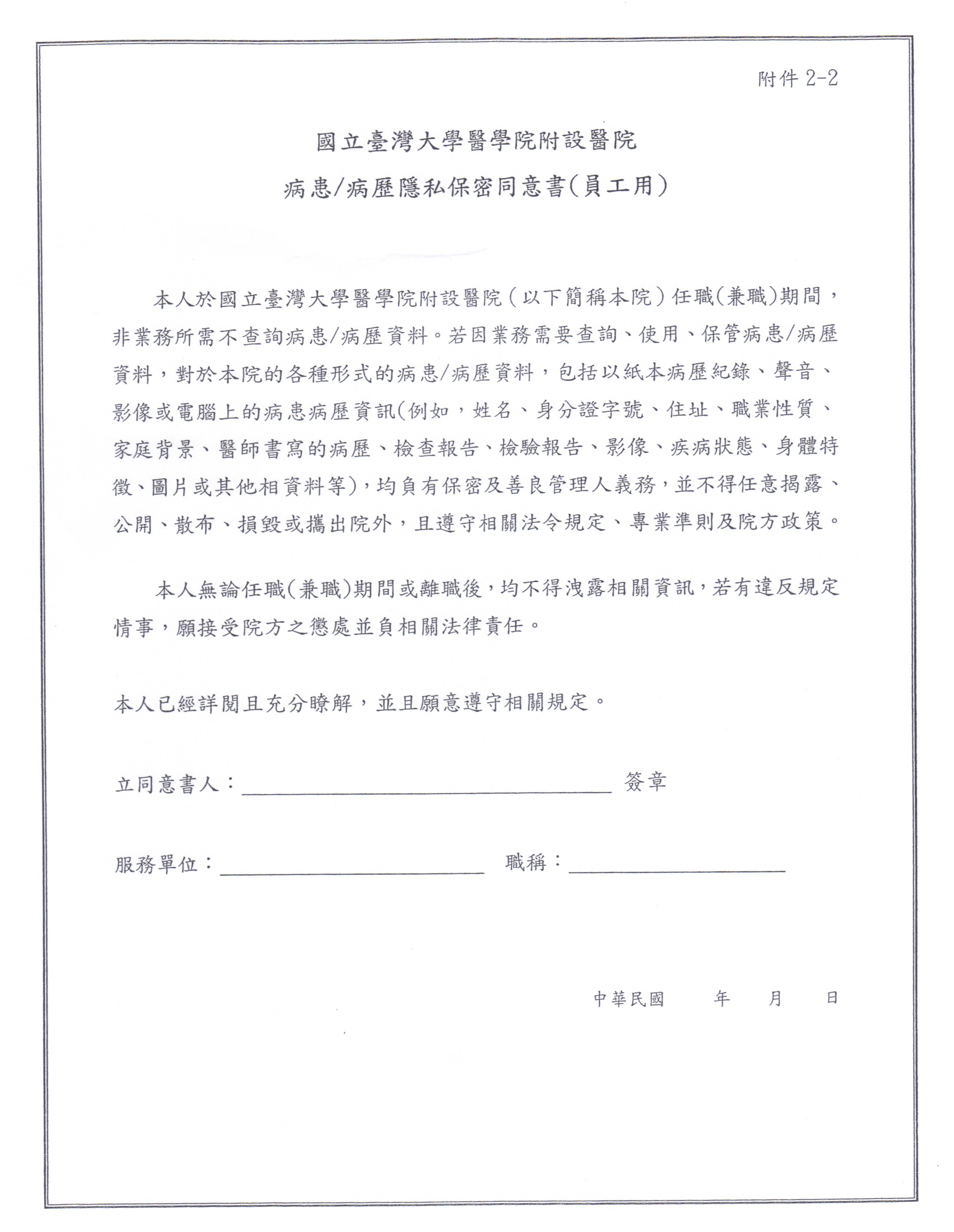 (2) 臺大醫院兼任主治醫師承諾書(附加檔。請印出、填寫)