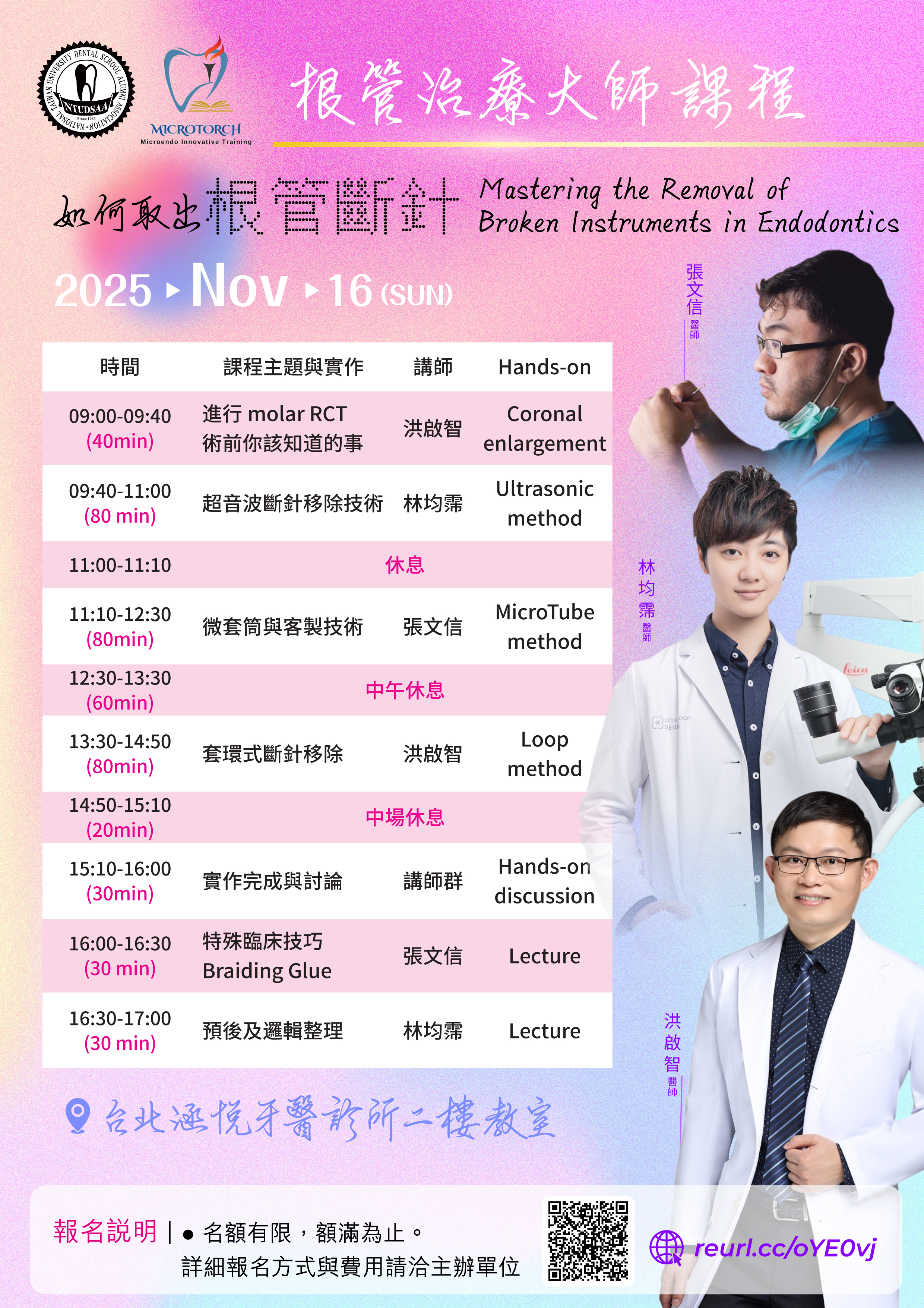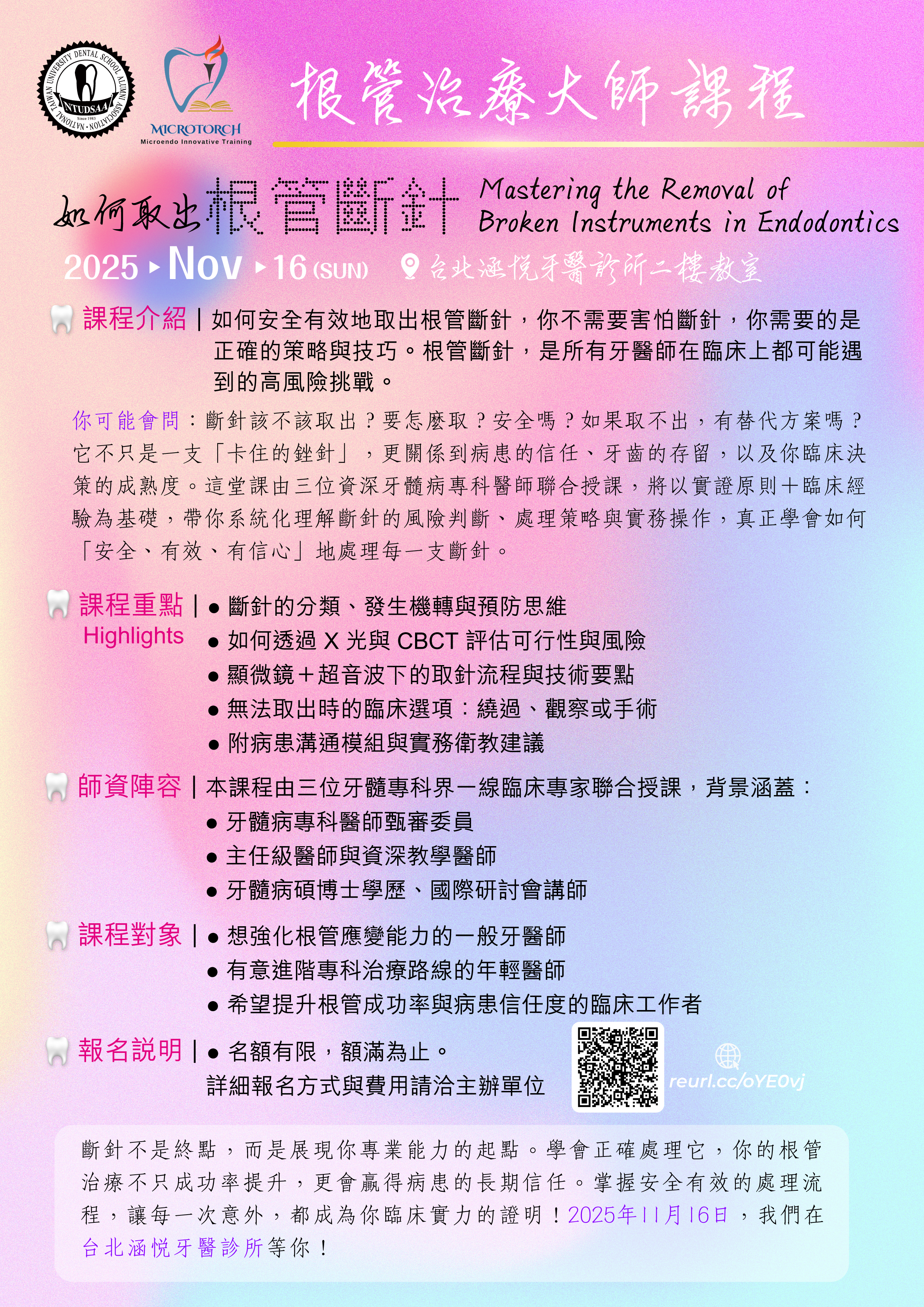 這堂課由三位資深牙髓病專科醫師聯合授課,將以實證原則+臨床經驗為基礎,帶你系統化理解斷針的風險判斷、處理策略與實務操作,真正學會如何「安全、有效、有信心」地處理每一支斷針。