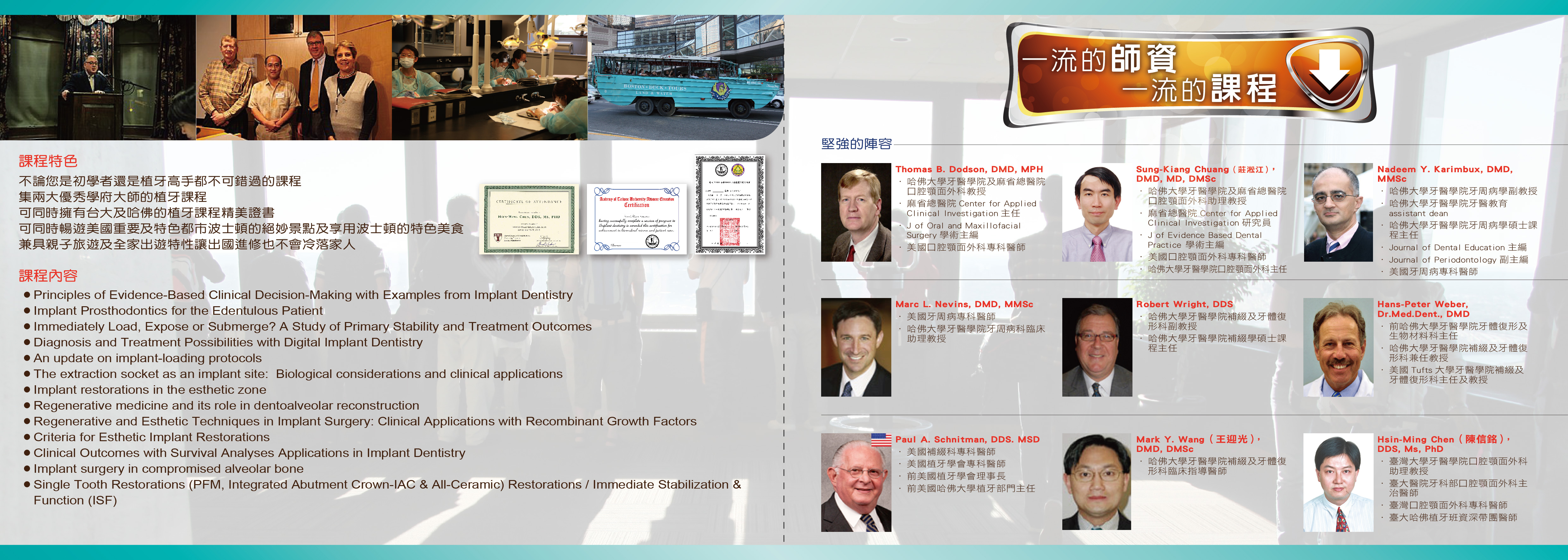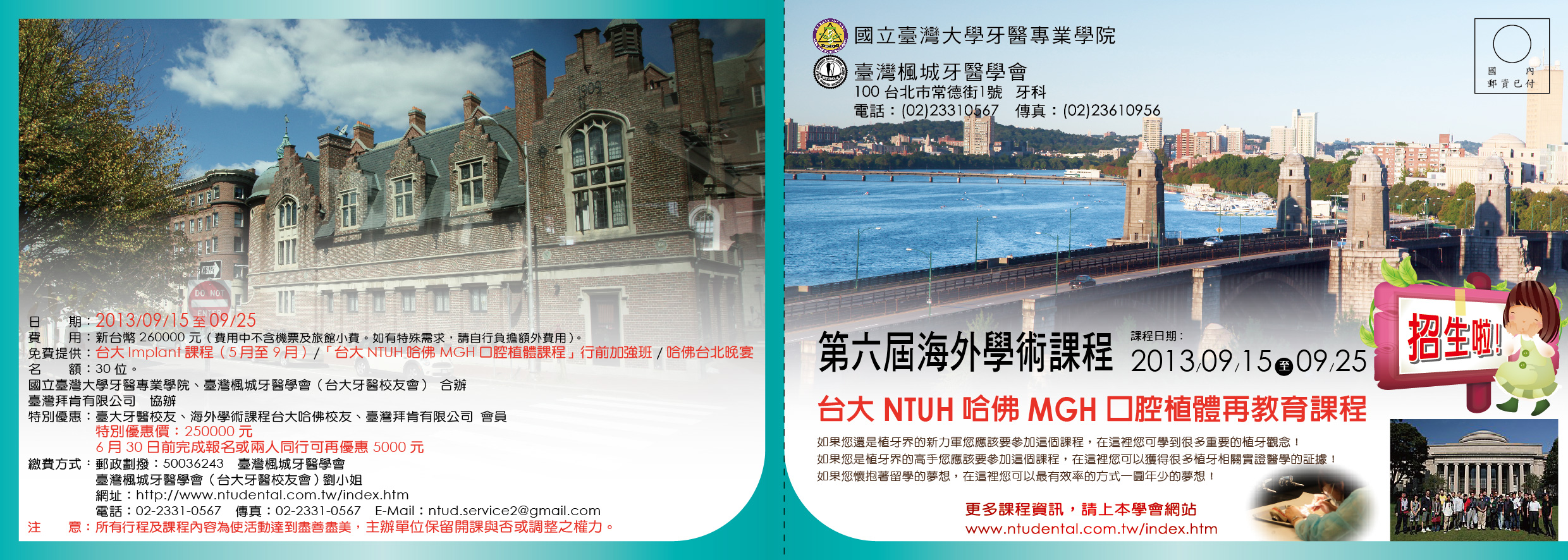 台大牙醫醫事人員訓練中心 第六屆海外學術課程 台大NTUH哈佛MGH口腔植體再教育課程 課程日期: 2013年09月15日至09月25日《請至"附加檔案"下載"報名表"》