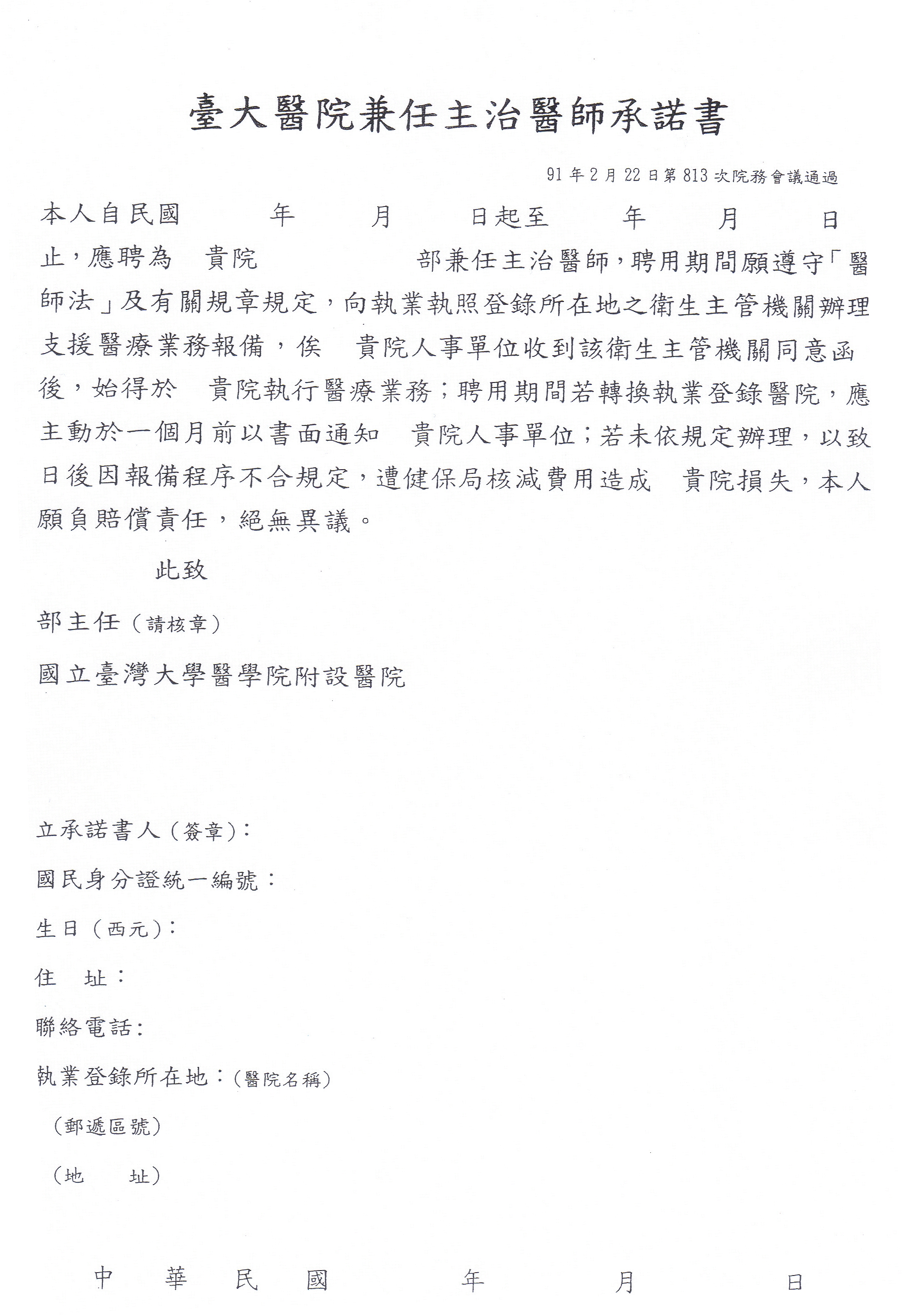 (2) 臺大醫院兼任主治醫師承諾書(附加檔。請印出、填寫)